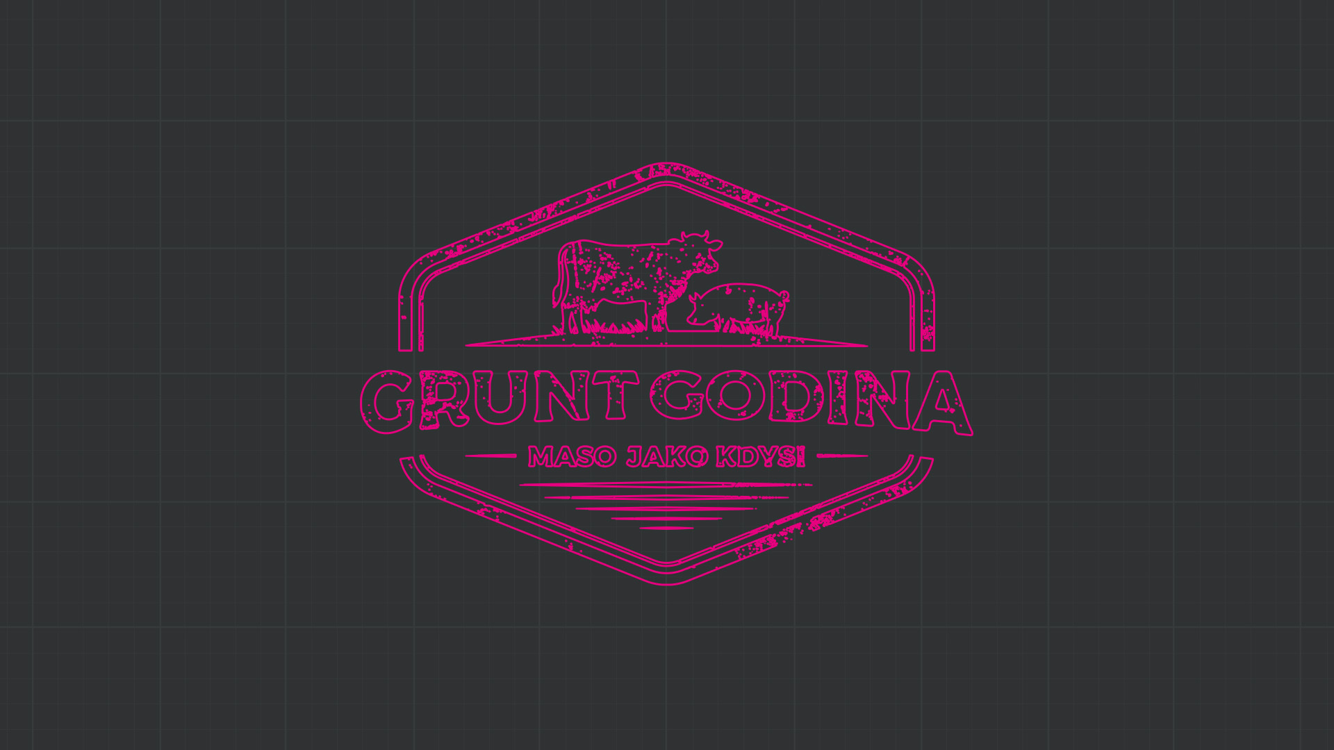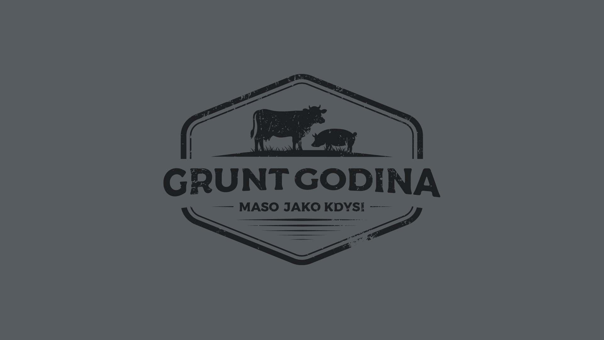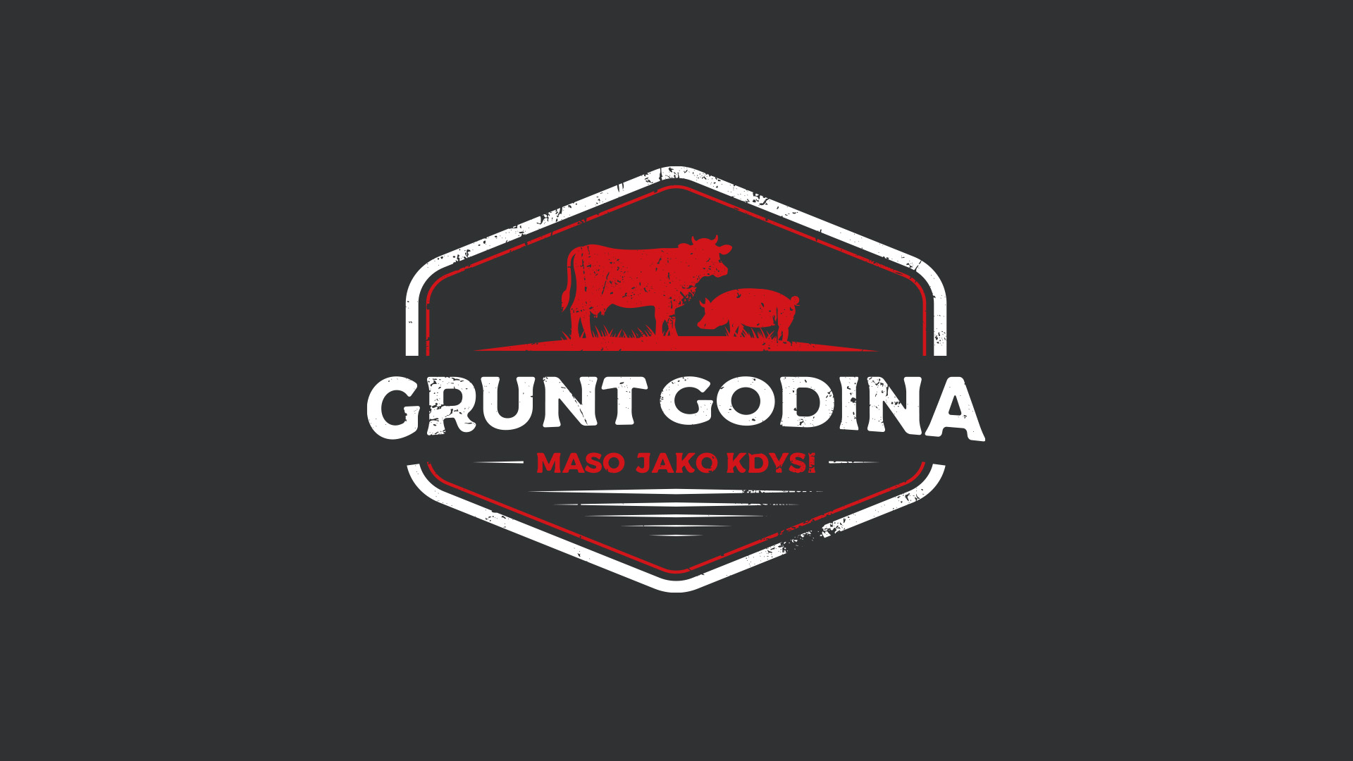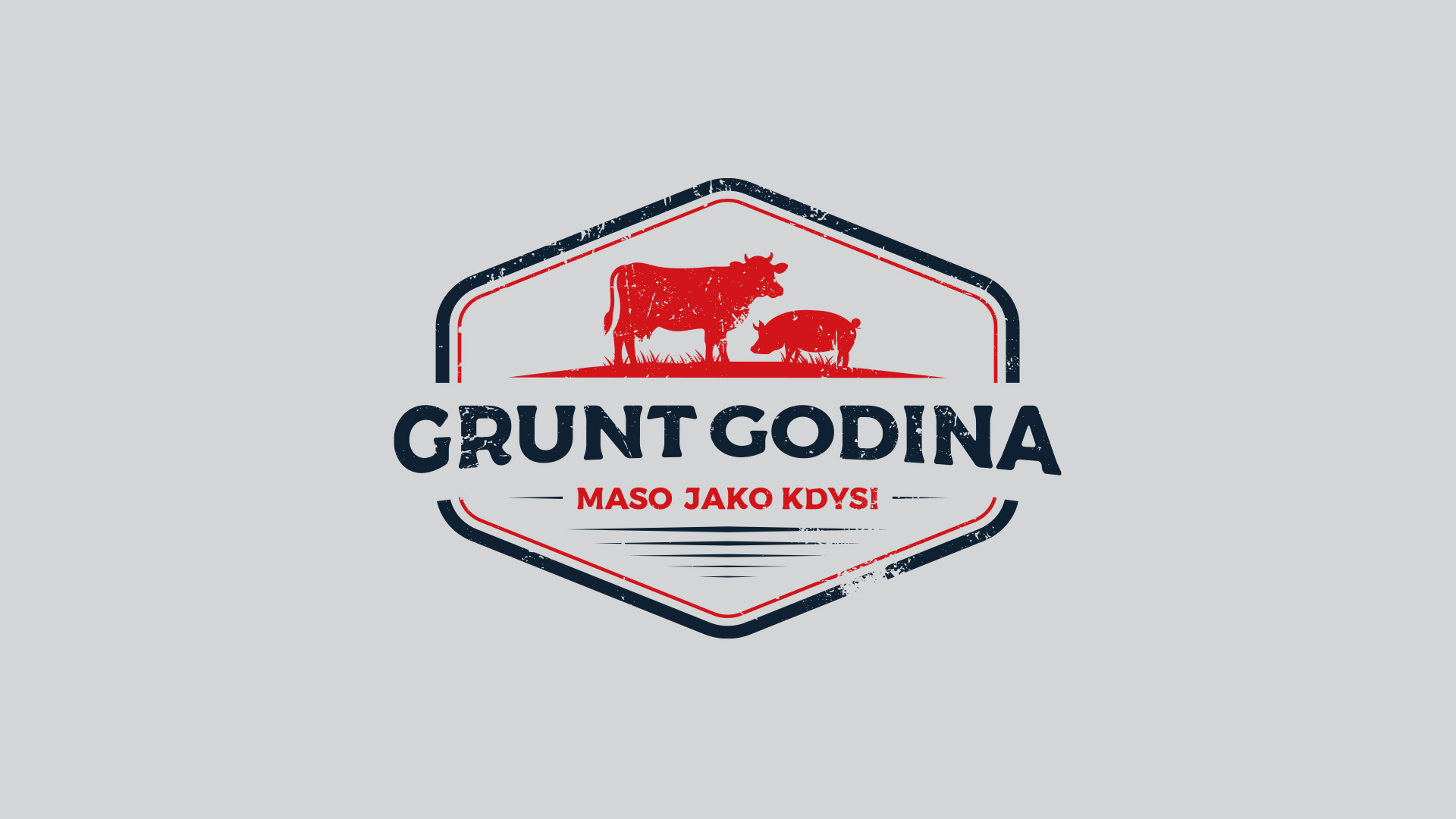 Pro značku Grunt Godina jsem navrhl autentické logo v rustikálním stylu, které vyzdvihuje tradici a kvalitu domácí výroby masa a uzenin. Logo je zasazeno do šestiúhelníkového rámu připomínajícího tradiční razítko nebo označení prověřené kvality. Dominantním prvkem je červená silueta krávy a prasete, které symbolizují hlavní druhy masa v nabídce. Toto jednoduché, ale výstižné zobrazení hospodářských zvířat okamžitě sděluje zaměření značky na masné výrobky z vlastního chovu. Barevná paleta kombinuje tmavě modrou a sytě červenou, což evokuje tradiční řeznické řemeslo a zároveň působí důvěryhodně a čistě. Záměrně aplikovaná textura opotřebení dodává logu autentický, nostalgický charakter, který podtrhuje slogan „MASO JAKO KDYSI“.